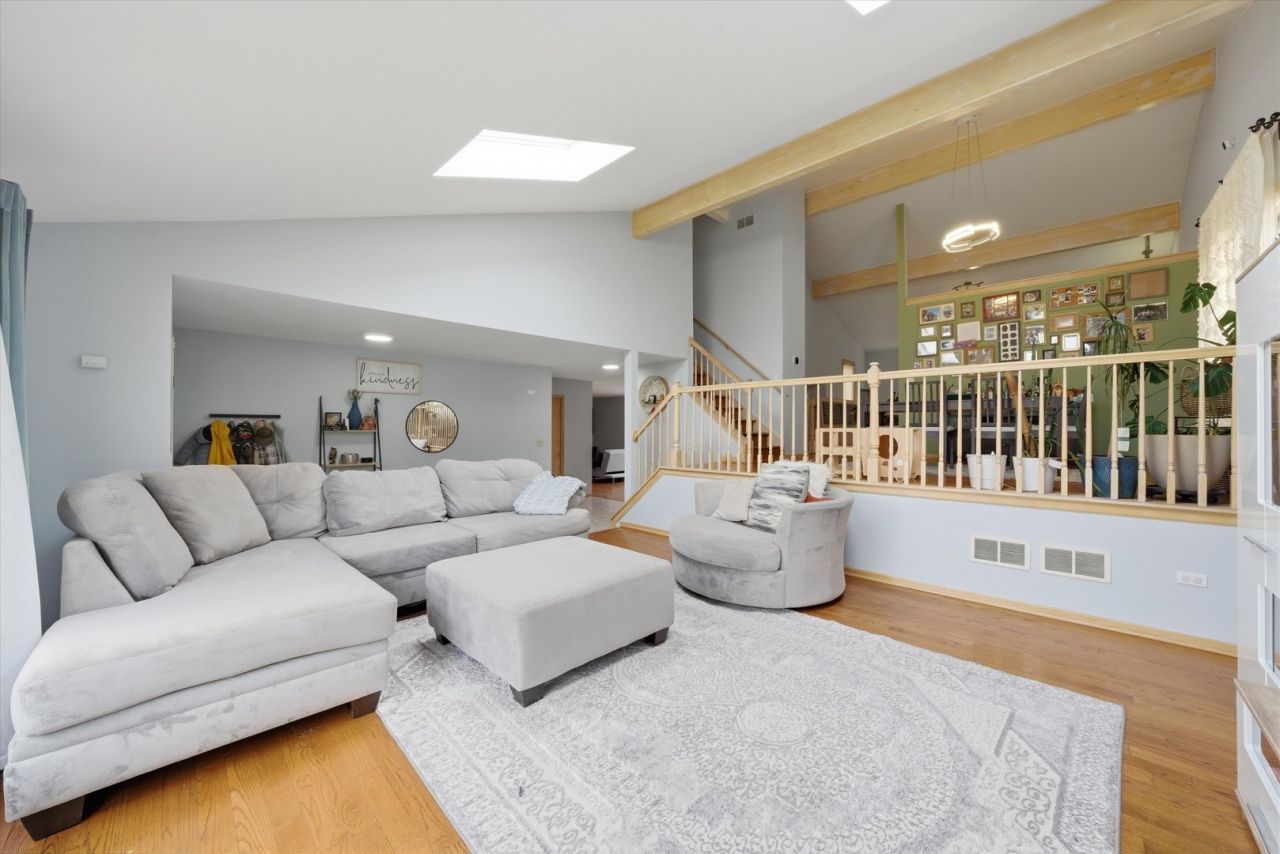 This beautifully maintained Forrester-style home offers an ideal blend of space, character, and modern updates, featuring 3 generously sized bedrooms and 2.5 bathrooms. Step inside to an impressive open-concept layout where the living room, dining area, and kitchen are highlighted by soaring cathedral ceilings with striking exposed beams, creating a warm yet airy atmosphere. Natural light pours in through well-placed skylights in both the living room and the primary bathroom, enhancing the home's bright and inviting feel. The spacious kitchen has been thoughtfully updated with sleek ceramic tile flooring, refreshed cabinetry, and newer stainless steel appliances, making it both functional and stylish for everyday living and entertaining. The oversized primary suite provides a relaxing retreat, complete with a private en-suite bath featuring a luxurious whirlpool tub. A partially finished basement adds valuable versatility, offering abundant storage along with additional space ready to be customized to suit your needs. Outdoors, you'll find an expansive, fully fenced backyard-perfect for gatherings, pets, or simply enjoying some privacy-along with a generous back deck that's ideal for relaxing or entertaining. With its combination of charm, openness, and modern touches, this home stands out as a truly desirable opportunity.